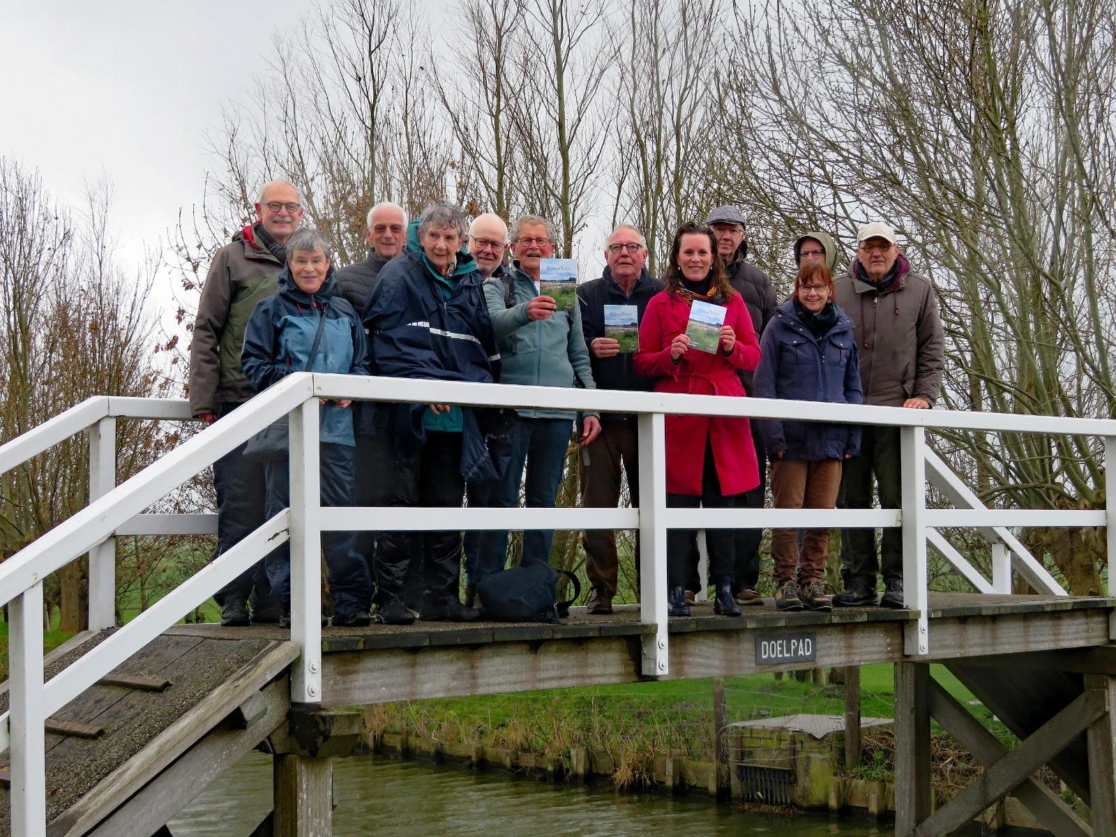 Op het bruggetje bij het Doelpad, waarover je dwars door de polder naar Maasland kunt lopen, is het fonkelnieuwe KERKenPADENboekje ten doop gehouden.